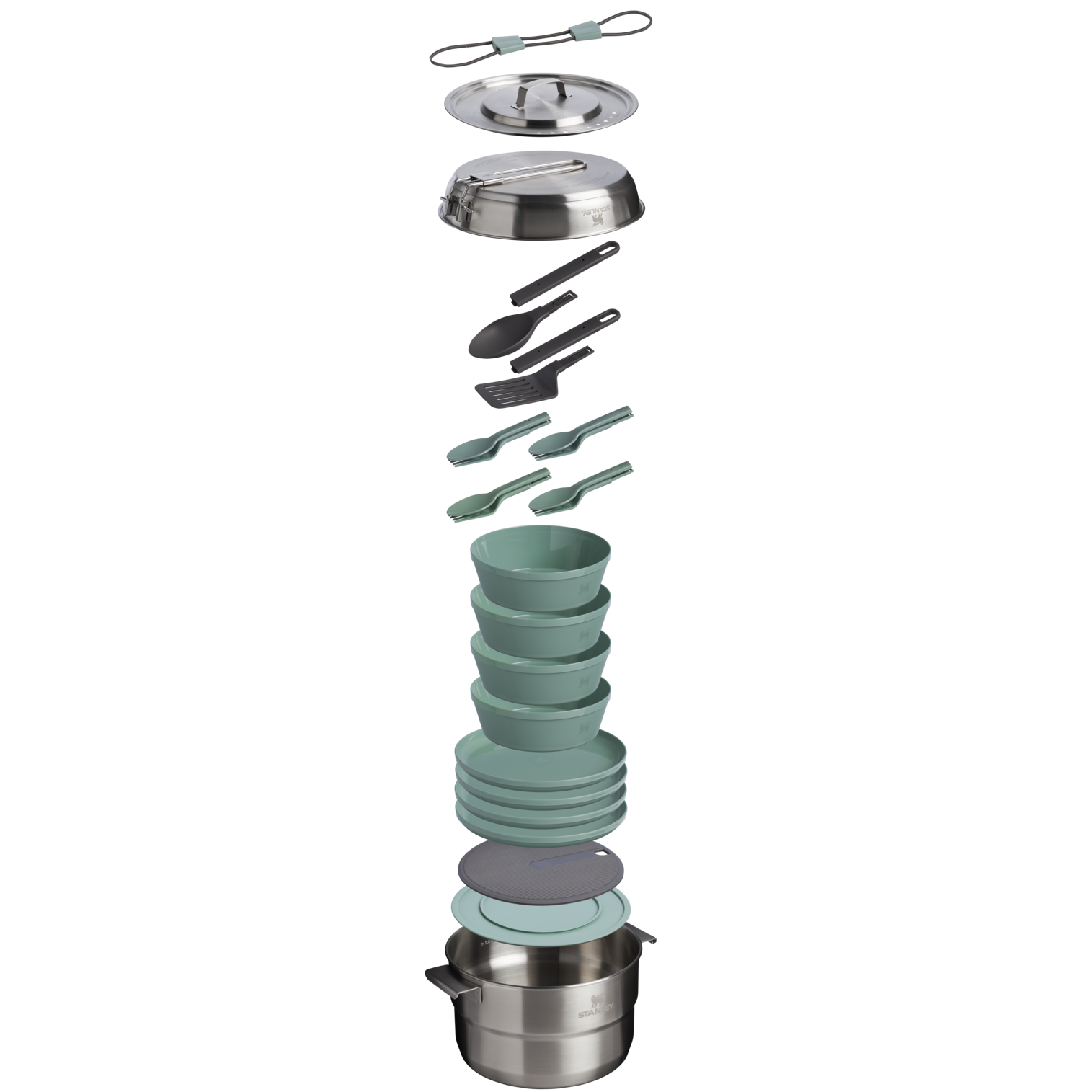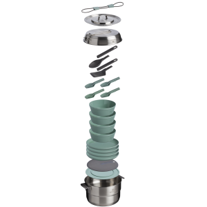 The Wildfare Core Fry Pan Cookset is a fully stocked kitchen. packed up neatly to go. This 26-piece set includes a 4-quart pot. 8-inch tri-ply fry pan. cooking utensils. and nonslip cutting board with a removable trivet. The four-person tableware set includes high-walled plates. stacking bowls. and dual-end cutlery for outdoor hosting with the comfort of home — everything you’d expect from a thoughtfully designed stainless steel cookware set for adventure-ready cooking.